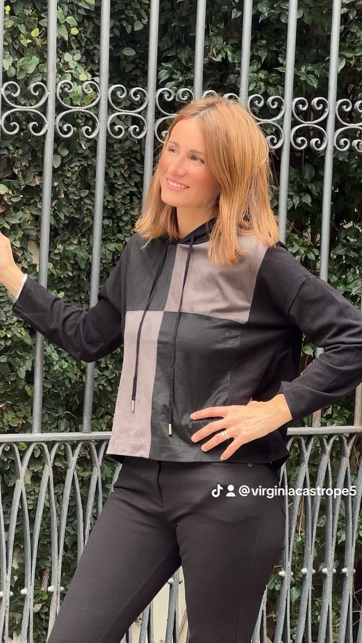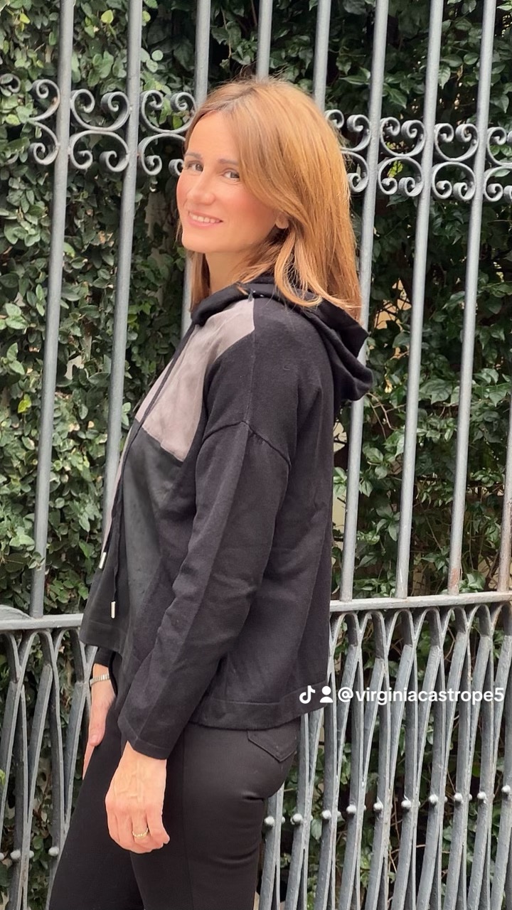Talla única, hasta 44 equivalente, contorno pecho 118cm, antelina por delante , el resto punto de sueter
